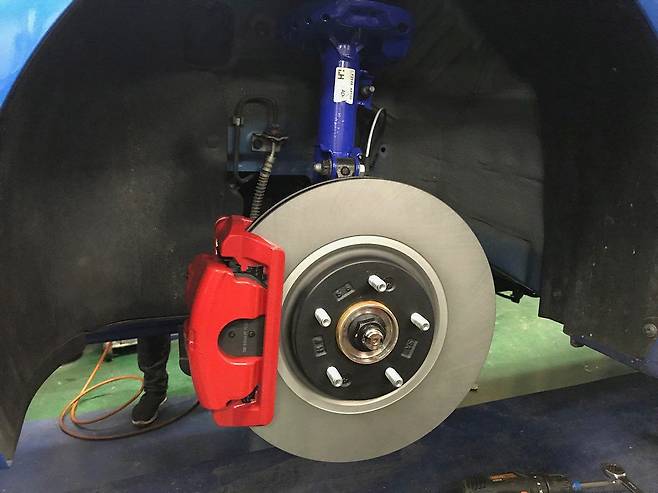 K5 GT 브레이크 셋은 디스크 로터 지름이 무려 330mm(아방스 순정은 305mm)이고 메탈 패드를 순정으로 달고 나옵니다. 아반떼 스포츠에는 브라켓 같은 거 없이 완벽 피팅. 한 방의 제동에도 잘 서주지만 반복 제동에서도 지치지 않아 좋습니다. 본인 차량의 제동력이 마음에 들지 않으신다면 한번 고려해 보세요. 추천합니다.