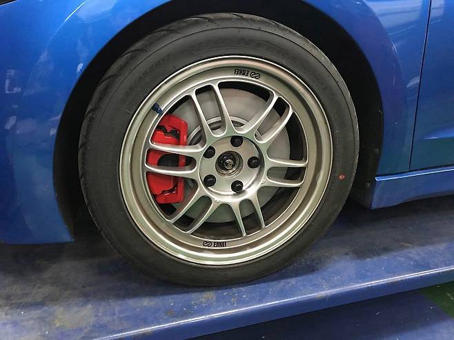 마지막으로 브레이크입니다. 사실 엔케이 RPF1은 림 안쪽이 좁아 끼울 수 있는 브레이크가 별로 없습니다. 이런 연유로 타이어나 서스펜션 고민보다 오랜 시간을 투자해 재고 또 쟀습니다. 고민 끝에 기아 K5 GT 순정에 들어가는 대용량 1P 브레이크 킷을 올렸습니다. 달고 보니 휠과 캘리퍼와의 간격이 빠듯합니다. 다행히 서킷에서도 간섭은 없네요.