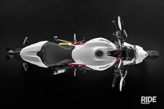 몬스터 797의 격자형태로 엮인 파이프 프레임은 단순한 부품이 아닌 진정한 몬스터 디자인을 완성시키는 결정적인 요소다. 더불어 공랭식 데스모듀에 L트윈 엔진과 와이드 핸들로 몬스터의 아이코닉한 부분을 잘 살렸다.
