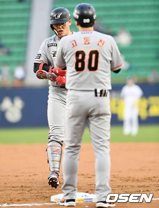 1회초 2사 1,2루 한화 이성열이 2타점 적시타를 날린 뒤 고동진 코치와 하이파이브를 하고 있다. /pjmpp@osen.co.kr