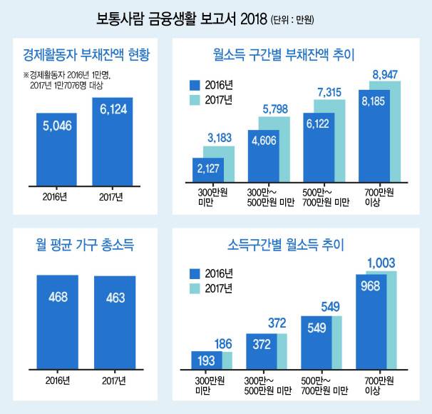 특히 저소득층 가구는 소득이 전년보다 7만원 감소했지만, 부채는 1056만원이나 늘어나 우려를 낳았다.