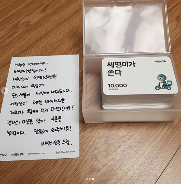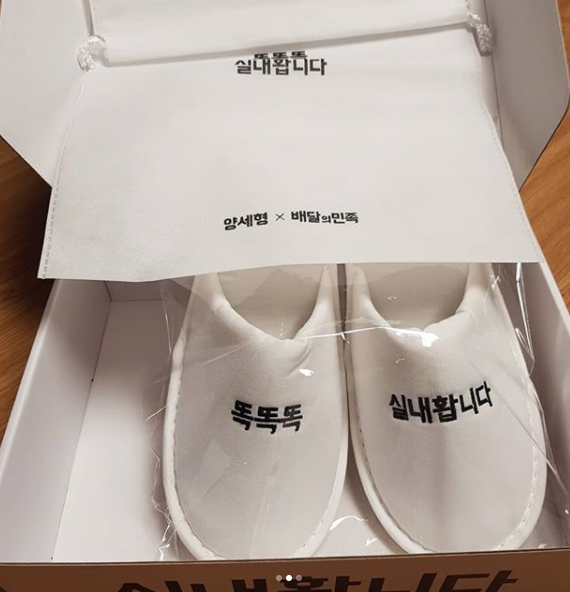 이와 함께 공개된 사진에는 '양세형X배달의 민족'이라고 적힌 상자 안에 실내화가 포장돼 있었다. 실내화 한쪽에는 '똑똑똑', 또 다른 한쪽에는 '실내홥니다'라고 적혀 있었다. 또 배달의 민족 측에서 보낸 수많은 쿠폰도 있었다. 쿠폰에는 '세형이가 쏜다'라고 적혀 있었다.