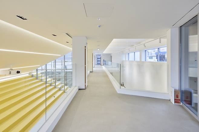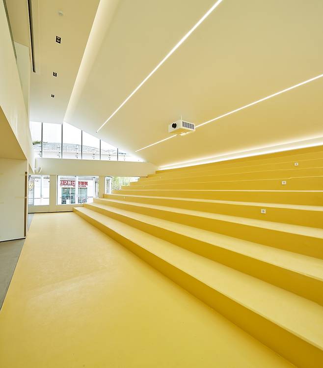 높이를 달리한 노랑색 계단에 앉아 열주 건너편 빠르게 움직이는 거리의 풍경을 한껏 여유롭게 감상할 수 있다. 계단 상층부의 경사진 지붕은 스테인리스스틸로 마감되어 계단에서 벌어지는 움직임과 주변 풍경을 오묘한 모습으로 흡수함으로써 공간의 깊이감을 북돋아준다. >> 위치 : 서울특별시 마포구 홍익로 18 층수 : 지하 1층, 지상 3층 면적 : 건축면적 521.45㎡/ 연면적 1,261.83㎡ 층별 면적 : 지하 1층 299.03㎡(91평)/ 1층 455.85㎡(138평), 2층 383.58㎡(116평)/ 3층 123.37㎡(37평) 발주처 : KB 국민은행 설계사 : 홍익대학교 산학협력단 감리사 : ㈜종합건축사사무소 시담 시공사 : ㈜이안알앤씨, 사진_ ANN 에이앤뉴스 김한석 기사 출처_ 에이앤뉴스 AN NEWS(ANN NEWS CENTER) 제공