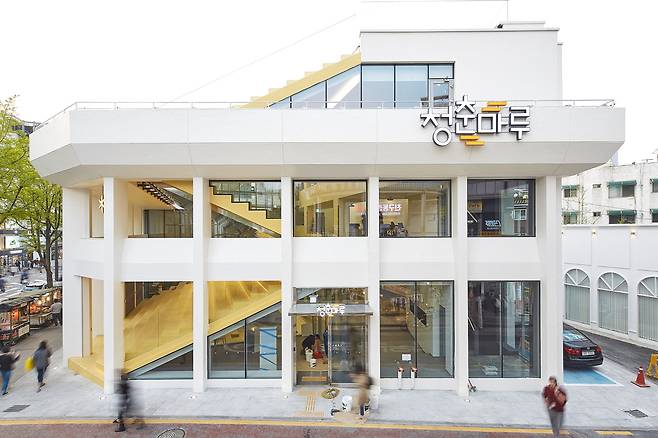 KB국민은행이 서울 홍익대학교 앞에 청춘마루를 새롭게 개관했다. 지하 1층에 지상 3층 규모의 건물은 그동안 40여 년 동안 국민은행 서교동 지점으로 활용되던 공간으로 리모델링을 거쳐 유스 고객 전용의 특별한 복합문화 공간으로 탈바꿈시켰다.