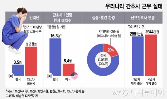 조성현 서울대 간호학과 교수는 "전체 공급 측면에서 간호사가 부족한 것이 아니다"며 "미국은 간호사 1명이 환자 5.4명꼴로 담당하지만 한국은 종합병원 기준 16.3명으로 3배 수준"이라고 말했다.