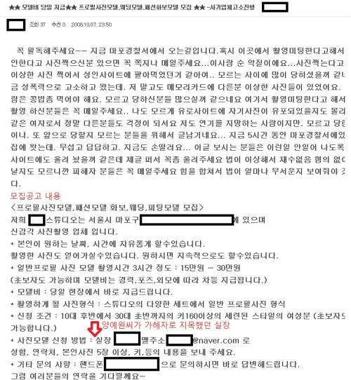 이어 "이런 일이 성행하기 시작한 것은 2005년부터다. 겉으로는 평범한 사진 동호회처럼 보이지만, 폐쇄적인 동호회 사이트 내부에서 사진을 공유하다가 몇 년이 지난 후 해외 불법 포르노 사이트로 유출되기 시작한다. 동시에 다음 카페 등의 공개된 장소에서 희생양을 삼을 만한 일반인 모델을 계속 모집해 왔다"면서 "이는 즉각적인 신고를 피하고, 용의자 특정을 어렵게 하기 위해서다"라고 설명했다.