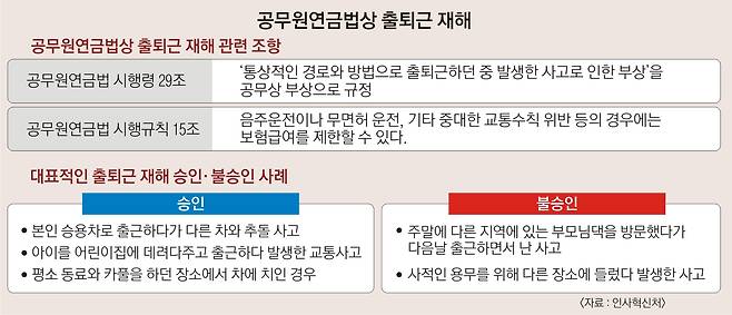 반면 주말에 다른 지역에 있는 부모님댁을 방문하다가 월요일 출근하다가 난 사고, 사적 용무를 위해 다른 장소에 들렀다 출근하다 발생한 사고 등은 인정되지 않는 경우가 많다. 강선영 공무원연금공단 재해보상실 차장은 “통상적인 경로와 방법이라는 판단 기준을 적용해 사건에 따라 인정 여부가 달라진다”고 설명했다.