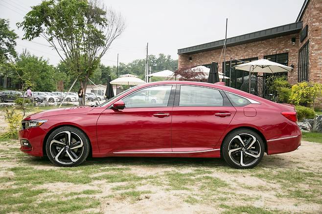 변화는 측면에서도 두드러진다. 이전까지는 전통 세단의 라인을 고집했다면 신형 어코드는 루프 라인을 아치로 그리며 C필러 부근을 길게 이어 스포츠 쿠페 형상을 표방했다. 또한, 리어 쿼터 글라스 아래로 꺾임을 주고, 측면 전체에 상·하단으로 분리된 강한 캐릭터 라인을 추가해 심심한 세단이 아니라는 점을 강조했다.