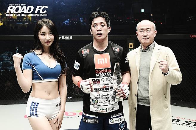 10일 서울 장충체육관에서 열린 XIAOMI ROAD FC 046 파트2 제 4경기 홍영기와 엄태웅의 경기가 끝난 후 굽네몰 김영철 대표가 승리를 거둔 홍영기와 함께 기념 촬영을 하고 있다.