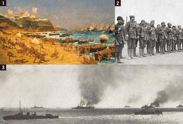 ① 갈리폴리 전투를 그린 ‘The Landing at Anzac’. 오스트레일리아와 뉴질랜드를 주축으로 한 영국-프랑스 연합군이 갈리폴리에 상륙하고 있다. ② 오스만 군. ③ 다르다넬스 해협 인근에 집결한 연합군 함대. <사진 : 위키피디아, http://www.history.com>