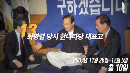 13위로 최병렬 당시 한나라당 대표(13위)가 노무현 전 대통령 측근 비리에 대한 특검 도입을 요구하며 단식했고 최근 사경을 헤매는 모습으로 들 것에 실려 갔던 김성태 대표(14위2018년 5월 3일~11일, 총 9일)가 ‘단식 정치인’ 15명 중 뒤에서 두 번째입니다.
