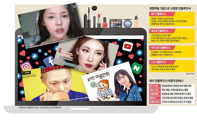 정씨처럼 뷰티 인플루언서로 활동하는 젊은 층이 늘어나고 있다. 인플루언서는 영향력 있는 개인을 말한다. 1인 미디어다. 블로그에서 시작해 유튜브, 인스타그램 등 소셜네트워크서비스(SNS)로 영역을 확장하고 있다. ‘뷰티쇼’라고 부르는 메이크업 동영상을 올리는 뷰티 인플루언서만 해도 수백 명에 이른다. 광고대행업계에 따르면 포니, 이사배, 씬님, 라뮤끄 등 유명 인플루언서들은 동영상 한 건에 최대 몇천만원의 돈을 버는 것으로 알려졌다. 화장품 업체들은 인플루언서를 전담 관리하는 직원을 따로 두고 있다. 신제품이 나왔을 때, 특정 이벤트가 있을 때 이들을 마케팅 채널로 활용하기 위해서다.