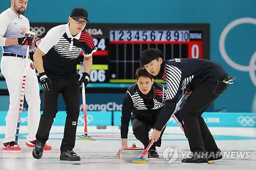 (강릉=연합뉴스) 최영수 기자 = 14일 오전 강원도 강릉시 컬링센터에서 열린 2018평창동계올림픽 컬링 한국-미국 예선. 한국의 김민찬(왼쪽부터), 김창민, 이기복이 스톤을 딜리버리하고 있다. 2018.2.14