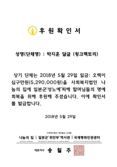 다음 쭉빵카페 ‘박지훈 달글(윙크팩토리)’ 측은 이날 매일경제 스타투데이에 "박지훈 군의 생일을 맞아 기부 서포트를 진행했다"면서 "이번 기부 서포트는 생존 일본군 '위안부' 할머니들을 위한 후원시설인 ‘나눔의 집’에 지훈군의 생일 날짜에 맞춘 529만원을 후원하는 것으로 진행됐다"고 알려왔다.