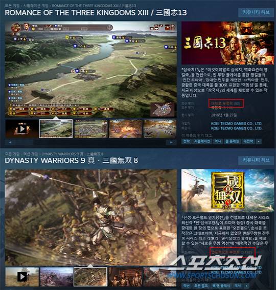 이렇게 역사 시뮬레이션 '삼국지'와 액션 게임 '진삼국무쌍'은 오래도록 사랑받은 시리즈지만, 최근 출시된 신작은 평가가 좋지 못하다. 밸브 PC 게임 플랫폼 스팀을 통해 2016년 출시된 '삼국지 13'은 유저 평가가 '대체로 부정적'이며, 지난 2월 13일 출시된 '진삼국무쌍 8'은 유저 평가가 '압도적으로 부정적'이다.