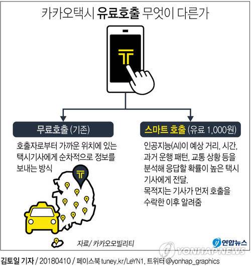 (서울=연합뉴스) 홍지인 기자 = 스마트폰 택시 호출 서비스인 카카오택시가 도입을 앞두고 논란을 빚었던 유료호출 서비스를 10일 개시한다.