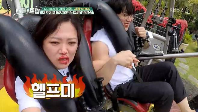 결국 성시경과 놀이기구를 타게 된 김숙은 스태프들에게 "995만 원만 빌려달라. 벌써 오줌 싼 것 같다"고 험한 말을 내뱉어 웃음을 줬다.