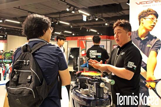 라켓을 구매한 고객에게 고일선 스트링거(오른쪽)가 무료 스트링 서비스를 제공했다