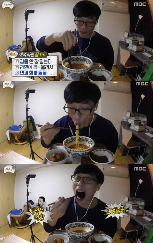'무한도전' 유재석, 야무진 라면 먹방 "김 싸먹으면 맛있어"