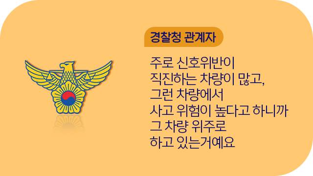 A. 주로 신호위반이 직진하는 차량이 많고, 그런 차량에서 사고 위험이 높다고 하니까 그 차량 위주로 하고 있는거예요. 최소 예산으로 사고 예방 효과를 극대화할 수 있는 장비와 설치 지점을 선정해야 하니까요.
