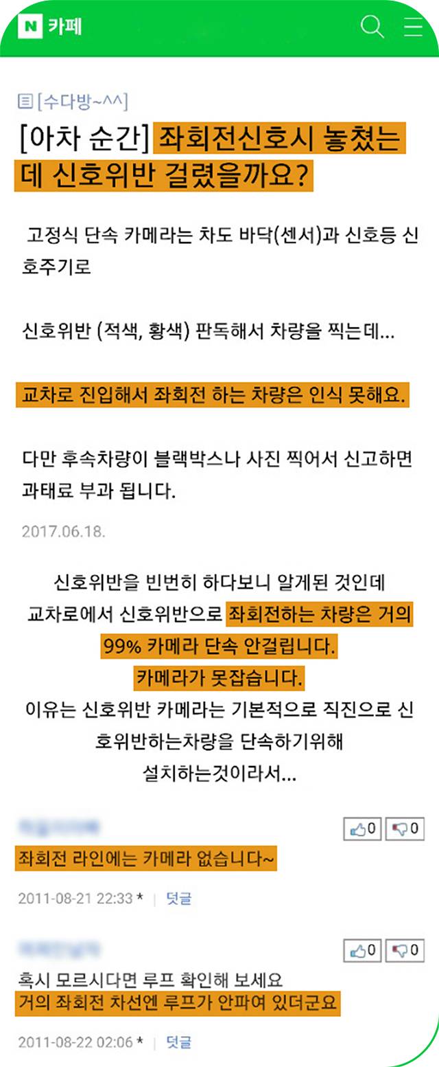 인터넷에는 '좌회전 신호 안지켰는데 걸렸을까요?' 물어보는 누리꾼들이 많았다. 답변들을 봤다.