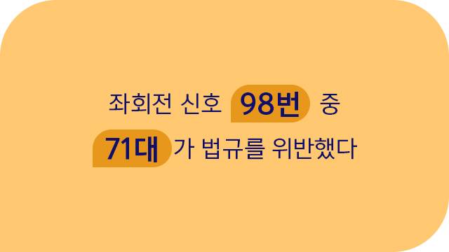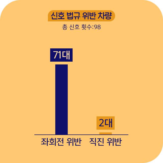98번 신호 중 좌회전 법규를 위반한 차량은 71대꼴, 직진 법규를 위반한 차량은 2대뿐이었다. 좌회전 위반이 압도적이다.