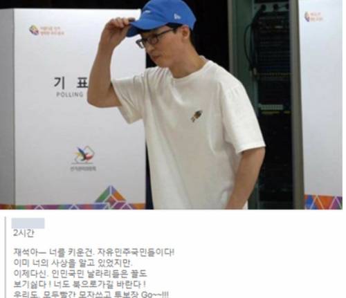 해당 글에는 “재석아 너를 키운건 자유민주국민들이다. 이미 너의 사상을 알고 있었지만, 이제 다신 인민국민 날라리들은 꼴도 보기 싫다. 너도 북으로 가길 바란다. 우리도 모두 빨간 모자 쓰고 투표장 GO~”라는 말이 적혀 있다.