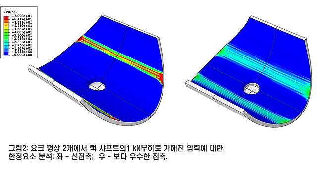 개별 고객의 요구 및 사양에 적합하게 설계된 조향요크 베어링은 자동차를 사용하는 동안 지속적으로 높은 품질을 보장한다. 일례로, 그림2는 2개의 요크 베어링 형상에 형성된 베어링 압력 분포 결과를 보여준다. 하나는 랙바에 접촉을 하는 형상이며, 다른 하나는 랙바와 조금 더 넓은 면으로 접촉하는 형상이다. 넓은 면에 접촉하는 형상의 조향 랙 요크는 압력을 감소시켜 부품의 마모를 줄일 수 있으며, 이는 조향 시스템에서 덜거덕거리는 소리 또한 줄여준다.