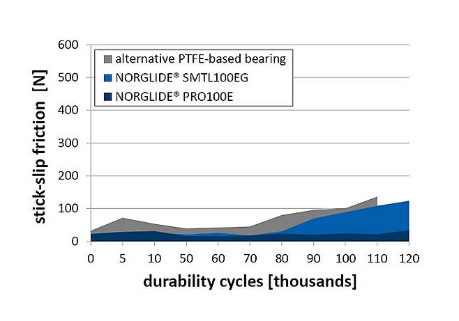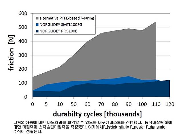마모율이 낮은 넓은 면 접촉베어링은 구조의 금속부분이 노출되지 않도록 보장한다.그림3에는 선접촉으로 설계된 청동 및 PTFE소결제품과 넓은 면접촉으로 설계된 2개의NORGLIDE® 요크 베어링의 마찰 및 스틱슬립에 대한 내구성 테스트 결과가 제시되어 있다. 청동과 PTFE 소결제품 베어링은 부품수명 주기 동안 마찰 값을 상당히 증가시키지만, NORGLIDE® 솔루션은 일관된 마찰 및 스틱 슬립 값을 유지해준다.