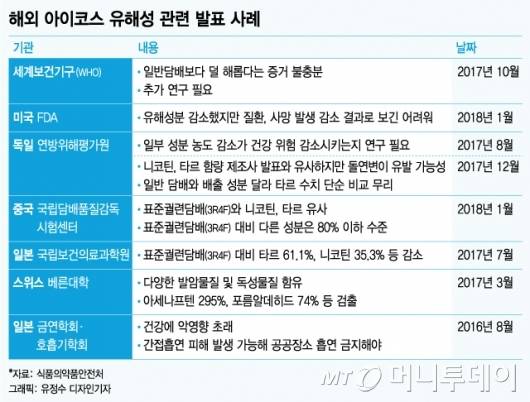 아이코스 등 궐련형 전자담배의 유해성에 대한 해외의 연구결과도 일반담배보다 덜 해롭다는 증거가 없다는 것이다.