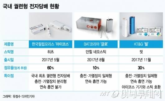 ◆'무서운 성장' 1년만에 점유율 10%=국내 궐련형 전자담배 시장은 지난해 5월 한국필립모리스가 '아이코스'를 선보이면서 개화했다. '전자담배계 아이폰'이라는 별명답게 날렵하고 세련된 디자인으로 소비자를 끌어당겼다. 그해 8월 BAT코리아가 '글로'를, 11월 KT&G가 '릴'을 출시하면서 현재 3각 경쟁구도가 형성됐다.