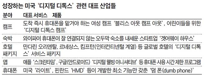 휴대폰을 맡기고 들어가는 만다린 오리엔탈 호텔의 '디지털 웰니스' 스파, 휴대폰·태블릿PC 등 모든 디지털 기기를 직원에게 넘겨야 체크인 할 수 있는 피츠버그 르네상스 호텔의 '디지털 디톡스 패키지', 프런트 데스크 금고에 휴대폰을 맡겨야 하는 포틀랜드 킴프턴 호텔의 '로맨스 부활 패키지' 등 디지털 디톡스를 주제로 한 글로벌 호텔 체인의 패키지 상품도 속속 나오고 있다. 블룸버그는 "잠시라도 디지털로부터 멀어지길 갈망하는 도시인들이 급증하자 도심의 럭셔리 호텔들이 간편한 디지털 디톡스 프로그램을 계속 출시하는 추세"라고 전했다.