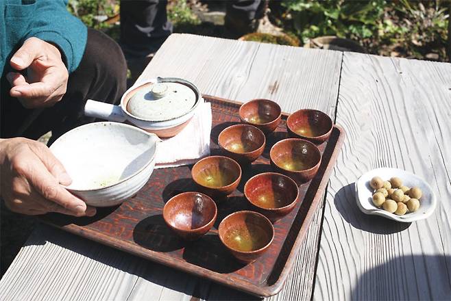 텐트는 푹신하고 따뜻했다. 새소리 알람에 깨어나 텐트를 여니 상쾌한 공기가 기지개를 펴게 했다. 새 아침이다. 텐트를 그냥 둔 채 움직여 보기로 했다. 오전에 호시노 야끼(星野焼) 공방 겐타가바(源太窯)에 들렀다. 메이지 이후 맥이 끊겼던 호시노 무라의 도자기를 복원해서 이어 나가고 있는 장인 야마모토 겐타(山本源太)씨를 만나기 위해서였다. 돗토리현에 살던 그는 80년간이나 맥이 끊긴 도자기를 찾아내서 스스로 계승자가 됐다. 가업을 이어받는 전통이 강한 일본에서 도공이 될 수 있는 방법이었다. 지역에서 채취한 철과 구리 성분의 유약으로 붉어진 진사(辰砂)도자기들은 저마다 오묘한 빛과 무늬들을 지니고 있다. 겐타씨가 진사 찻잔에 야메 녹차를 따르자 마법이 일어났다. 녹차가 반짝반짝 금빛으로 변한 것. 깜짝 놀라 마셔 보니 녹차인 것이 분명하다. 그가 갈고닦은 연금술은 흙을 작품으로, 녹차를 금으로, 한 청년을 장인으로 만들었다. <흙도둑 土泥棒>이라는 책을 냈던 그는 방문객들의 마음도 남김없이 훔쳐 버렸다.
