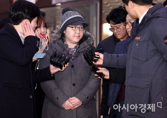 이대목동병원 신생아 연쇄 사망사건 '업무상 과실치사 혐의'를 받고 있는 신생아 중환자실 주치의 조수진 교수가 16일 서울 종로구 서울지방경찰청에서 소환 조사를 받기 앞서 기자들의 질문을 받다 변호사를 바라보고 있다. 조 교수는 지난달 16일 오후 이대목동병원 신생아 중환자실에서 신생아 4명이 시트로박터 프룬디균에 감염돼 패혈증으로 사망한 사건과 관련, 간호사들과 주치의를 지도·감독할 의무를 다하지 못한 혐의를 받고 있다./김현민 기자 kimhyun81@