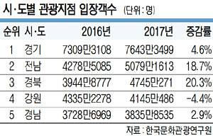 시·도별로는 지난해 7643만 명을 유치한 경기가 2016년에 이어 1위를 지켰고, 전남(5079만 명)이 2위, 경북(4745만 명)이 3위를 차지했다. 전남과 경북은 방문객이 1년 새 각각 800만여 명 증가해 순위가 한 단계씩 올랐다. 전남도와 경북도는 관광객 증가원인을 △교통접근성 향상 △수도권 등 집중 마케팅 △차별화된 관광상품 개발 등으로 자체 분석했다. 2016년 4335만 명으로 2위였던 강원도가 지난해 4145만 명으로 줄어 4위로 내려앉은 것은 ‘포켓몬고 열풍’이 식었기 때문으로 분석된다.