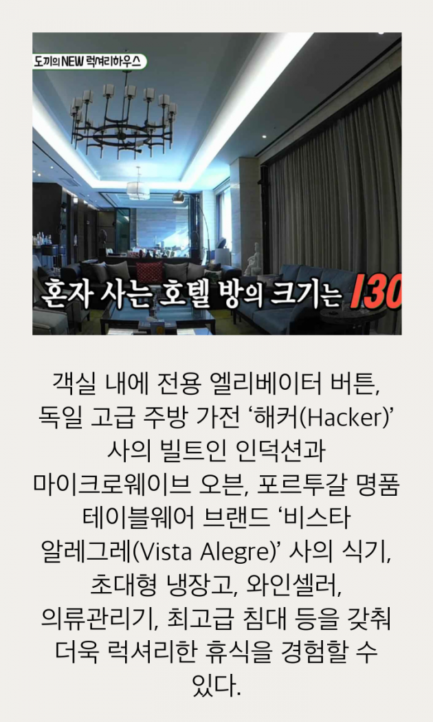 객실 내에 전용 엘리베이터 버튼, 독일 고급 주방 가전 ‘해커(Hacker)’ 사의 빌트인 인덕션과 마이크로웨이브 오븐, 포르투갈 명품 테이블웨어 브랜드 ‘비스타 알레그레(Vista Alegre)’ 사의 식기, 초대형 냉장고, 와인셀러, 의류관리기, 최고급 침대 등을 갖춰 더욱 럭셔리한 휴식을 경험할 수 있다.