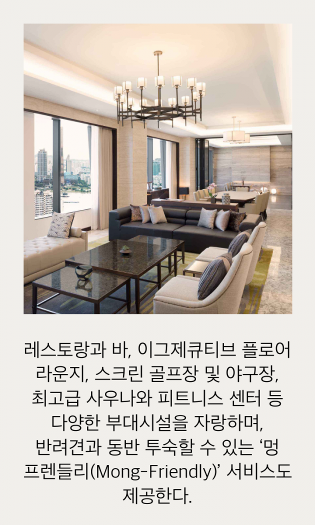 레스토랑과 바, 이그제큐티브 플로어 라운지, 스크린 골프장 및 야구장, 최고급 사우나와 피트니스 센터 등 다양한 부대시설을 자랑하며, 반려견과 동반 투숙할 수 있는 ‘멍 프렌들리(Mong-Friendly)’ 서비스도 제공한다.