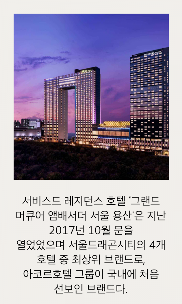 서비스드 레지던스 호텔 ‘그랜드 머큐어 앰배서더 서울 용산'은 지난 2017년 10월 문을 열었었으며 서울드래곤시티의 4개 호텔 중 최상위 브랜드로, 아코르호텔 그룹이 국내에 처음 선보인 브랜드다.
