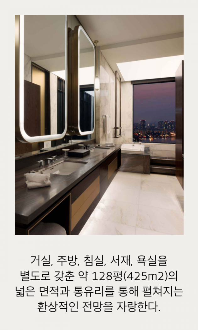 거실, 주방, 침실, 서재, 욕실을 별도로 갖춘 약 128평(425m2)의 넓은 면적과 통유리를 통해 펼쳐지는 환상적인 전망을 자랑한다.