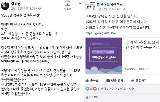 "저는 이게 정당한 문제 제기라고 생각한다. 2003년 사건 뒤 저는 운동 단체에는 가지 않게 됐다. 당시 함께했던 친구들과의 관계도 거의 끊겼고, 무엇보다 사람에 대한 믿음을 잃게 됐다. 말로만 '진보·정의'를 외치는 사람은 절대 믿지 않는다. 강위원씨가 말이 아닌 행동으로 보여주길, 이제라도 당시 성폭력을 인정하고 사죄하길 바랄 뿐이다."