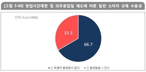아울러 일반 소비자 1천980명을 대상으로 작년 9월 설문조사한 결과 영업시간제한 및 의무휴업일 제도에 대해 66.7%는 "특별히 불편함이 없다"고 답했다.