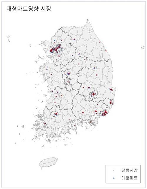 연구진은 ▲대형마트 영향 시장(시장으로부터 대형마트가 2.5㎞ 안에 있으면서 SSM이 1.5㎞ 안에 없는 시장) ▲SSM 영향 시장(대형마트가 3.0㎞ 이상 떨어져 있으면서 SSM이 1.0㎞ 안에 있는 시장) ▲무영향 시장(대형마트가 3.0㎞ 이상, SSM이 1.5㎞ 이상 떨어진 시장)으로 나눠 영업규제 효과를 측정·분석했다.