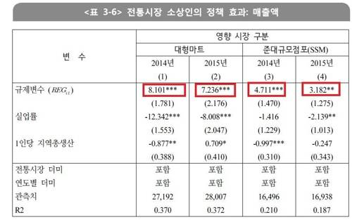 연구를 수행한 이원우 서울대 교수와 최유경 법제연구원 부연구위원은 "대형마트에 대한 규제가 대형마트의 매출을 줄이고 전통시장의 매출을 증가시킨 것으로 나타나 규제가 의도했던 목적을 어느 정도 달성하고 있음을 확인했다"고 말했다.