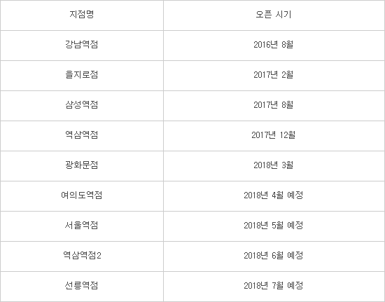 4월 여의도역점과 5월 서울역점, 6월 역삼역점, 7월 선릉역점까지 매달 새로운 지점이 생겨난다. 총 9개 지점이다. 한국 진출 2년도 안 돼 올린 성과다. 하반기 예정인 지점까지 더하면 올해 두자릿수로 늘어날 전망이다.