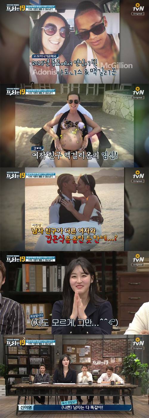 13일 오후 방송된 케이블채널 O tvN '프리한19'에서 신아영은 "욕망이 부른 현실판 사랑과 전쟁 19. 15위는 '사람의 탈을 쓴 짐승남'이다"라고 운을 뗐다.
