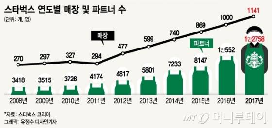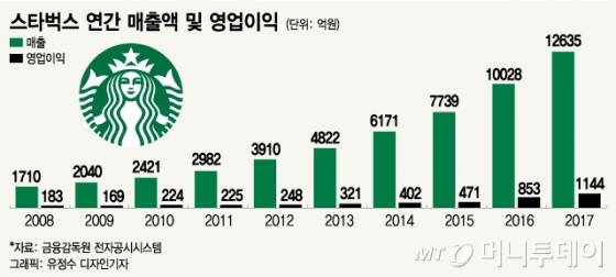 스타벅스커피 코리아(이하 스타벅스)는 국내 커피업계에서 독보적 강자다. 지난해 매출은 1조2634억원, 영업이익은 1144억원이다. 스타벅스 한 브랜드만으로 CJ 외식브랜드 집합체인 CJ푸드빌 매출(1조2590억원)을 뛰어 넘는다.