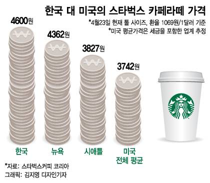 24일 스타벅스커피 코리아에 따르면 한국 스타벅스에서 판매 중인 카페라떼 톨 사이즈 가격은 4600원으로, 미국 평균 가격 3742원(세금 포함 3.5달러·달러당 원화 환율 1069원 기준)보다 약 23% 비싸다. 미국은 주마다 가격이 제각각이며 대도시는 평균보다 높다. 뉴욕은 4362원(세금 포함 4.08달러)이고, 스타벅스 본산지인 시애틀은 3827원(세금 포함 3.58달러)이다. 한국이 뉴욕보다 238원, 시애틀보다 773원 비싼 것이다.