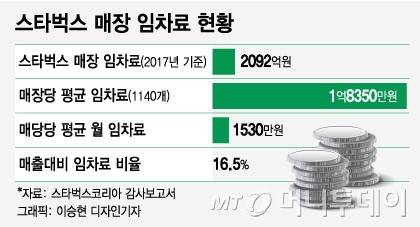 스타벅스 코리아는 매장당 평균매출과 임차료를 공개하지 않는다. 다만 2017년도 감사보고서에 따르면 지난해 기준 매장 임차료는 총 2092억원 이었다. 지난해 매장수 1140개로 나누면 매장당 연간 임차료는 1억 8350만원 꼴이다. 월 임차료로는 1530만원 정도다. 매출대비 임차료 비중은 16.5%다.