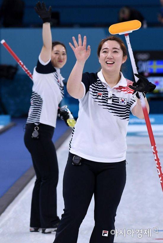 2018 평창동계올림픽 컬링 여자 예선 대한민국(김은정, 김경애, 김선영, 김영미, 김초희)과 스웨덴의 경기가 19일 강릉컬링센터에서 열렸다. 대표팀 김영미(오른쪽)과 김경애가 7-6으로 승리한 뒤 관중들 향해 인사하고 있다./강릉=김현민 기자 kimhyun81@