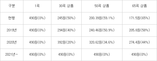 개정안에 따르면 현행 징수규정상 30곡 이상 묶음 다운로드 상품에 적용 가능했던 할인율이 단계적으로 폐지된다. 지금까지는 해당 상품에 한해 50%에서 최대 65%까지 가격을 낮출 수 있었다. 문체부는 할인율에 3년간 조정계수를 적용해 2021년부터 할인율을 완전 없애기로 했다.